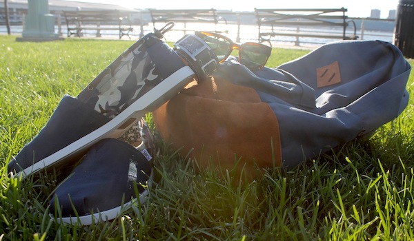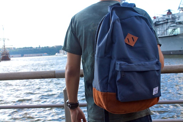 Shot by the Intrepid, I styled Eric here with John Varvatos’ silk-blend Hampton polo in dry fig and a pair of dark wash, skinny jeans from Express. Accessories include are VonZipper’s new Commonwealth sunglasses in torte, a brown cuff watch from GUESS, and the tech-friendly Herschel Supply Heritage backpack—all of which matched the navy canvas and brown suede stringing the eyelets perfectly.