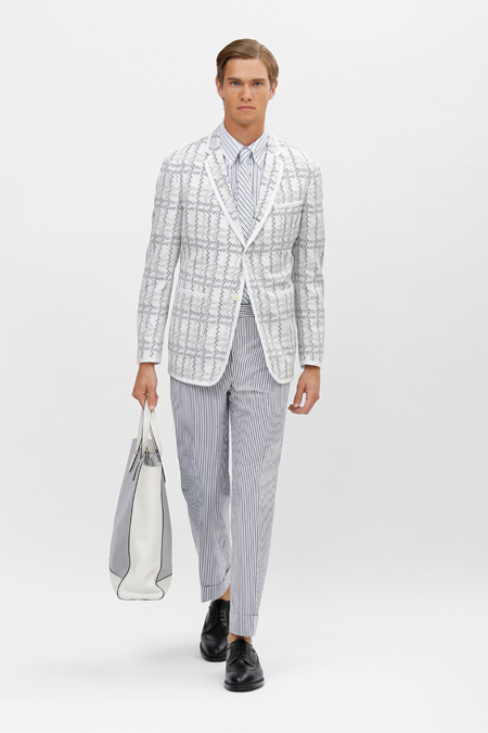 Thom Browne focuses on three sets of color schemes: black and white, reds and navy, and grey and beige.