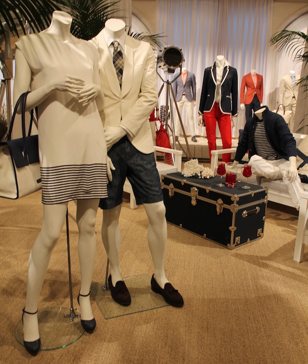 Accessories include new styles of shoes such as the navy and white Spectator wingtip, color block pebble grain leather totes, and nautical belts and espadrilles with braided embroidery.