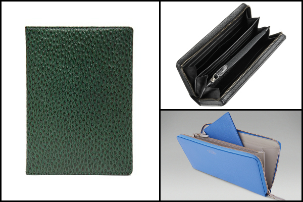 From the British luxury goods brand Smythson, and its lightweight and modern Panama Collection, the crossgrain calf leather Nile Blue travel wallet stands out for its vibrant color. It comes with a removable passport cover that can be used on its own. ($670, Smythson)
