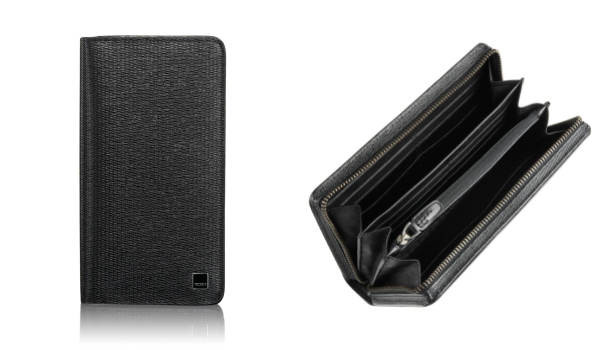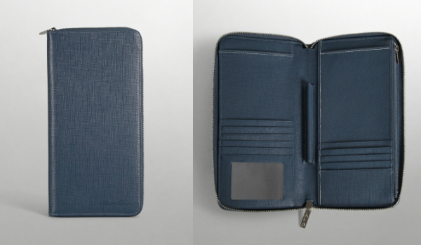 The textured midnight blue leather travel case from Kenneth Cole can hold 10 cards in their own slots, includes a zipper pocket on its left side and bill compartment on the other, and has a pen loop so the user always have a pen or pencil handy ($90, Kenneth Cole).