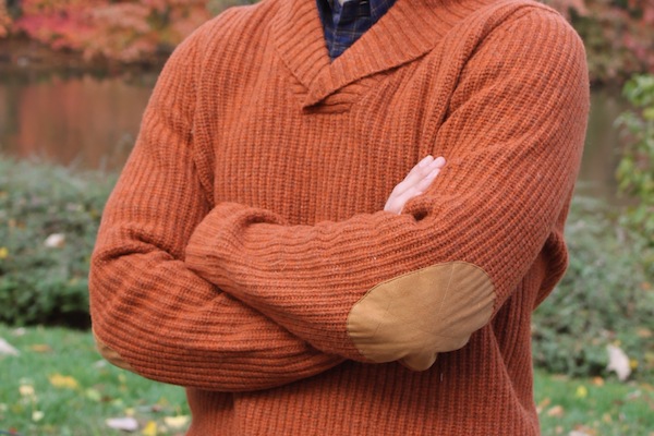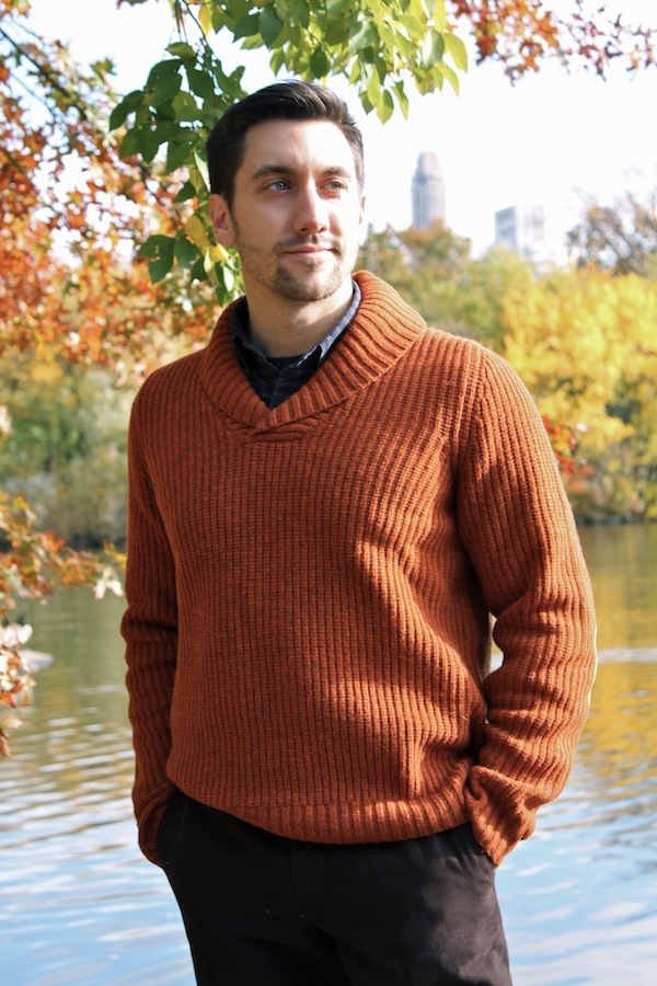 American classic Brooks Brothers’ lambswool shawl collar sweater is perfect to keep warm, and has the added feature of suede elbow patches that makes it a sophisticated sweater. I paired the orange sweater with the Milano Fit Brushed Twill Pants (which will work both in the office and on the weekend) and with an olive and purple plaid shirt from J.Crew. I topped off the look with a pair of rugged, scotch grain derby boots from British footwear heritage brand Grenson.