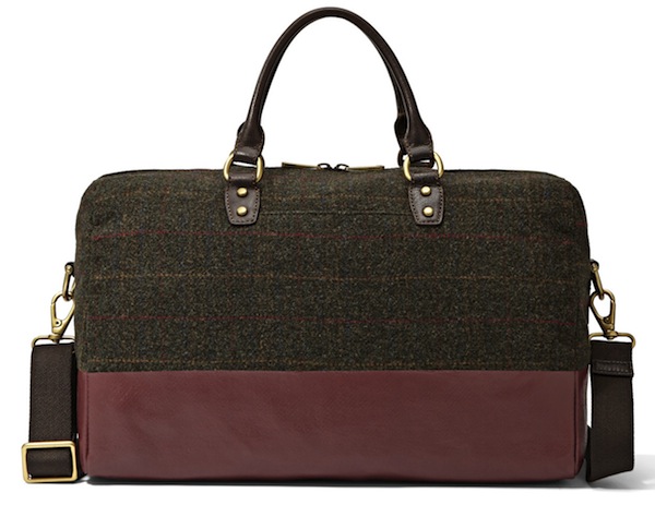 A classic design from Fossil, this twill duffle comes in an olive grey flannel pattern and a burgundy leather base. Golden brass hardware accompany the leather handles and the detachable strap. ($228, Fossil)