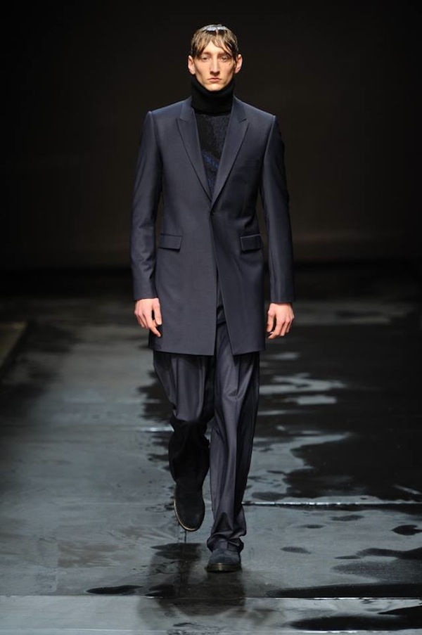 Chunky sweaters, topcoats, overcoats, mixed media peacoats and raincoats filled out its line up, and those raincoats were put to the test at the end when the models were drenched during the final walk. Watch the of the full show video at the end.