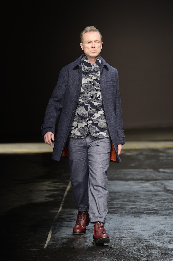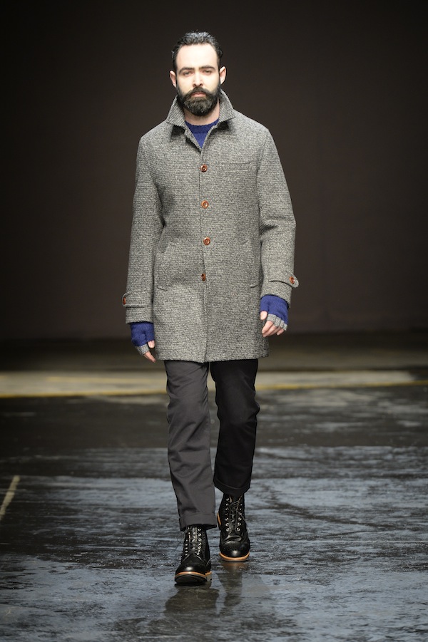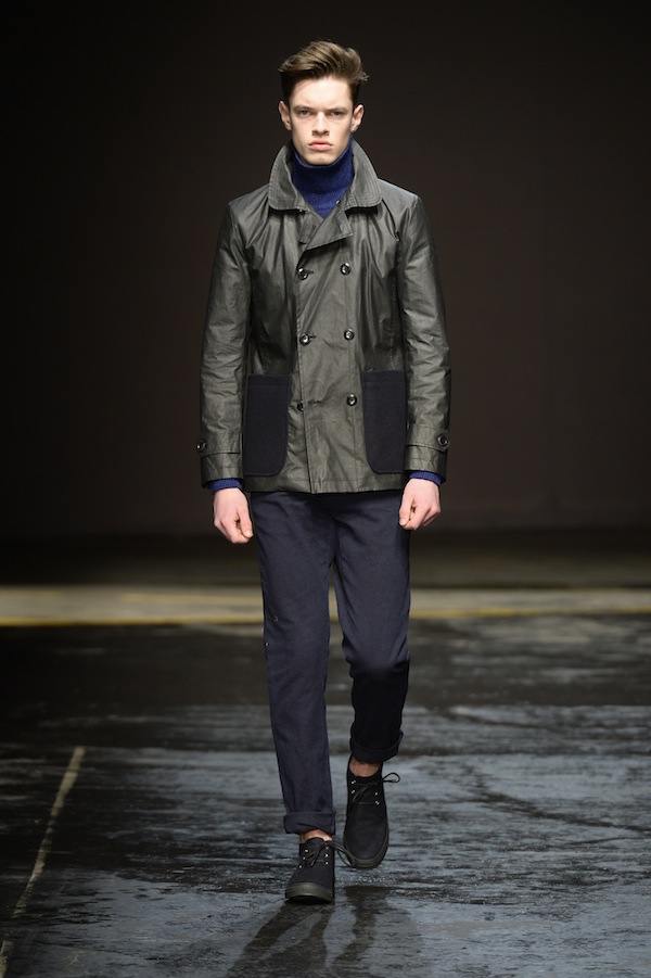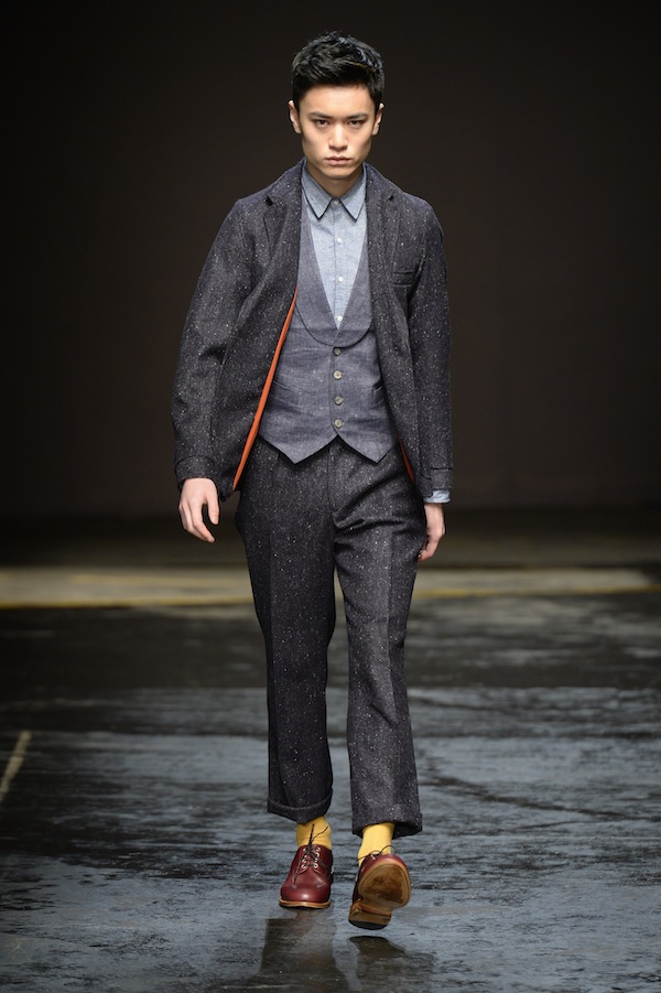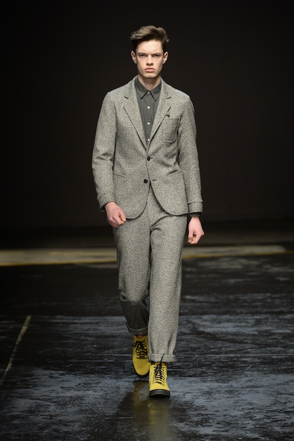Part of the final day of London Collections: Men, Oliver Spencer’s autumn/winter 2014 collection featured the designer’s passion of combining modern and classic styles. Charcoal, navy and forest green are the main focus of colors used, along with hints of bright tones such as orange and yellow and the neutrals of tan and black.