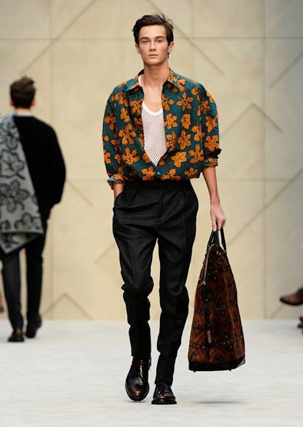 The highlight of London Collections: Men’s final day was undoubtedly the Burberry Prorsum menswear presentation in Hyde Park. Designer Christopher Bailey’s autumn/winter 2014 collection featured both neutral solid tones with colorful patterns and prints on over-sized silk scarves, man bags and overcoats.