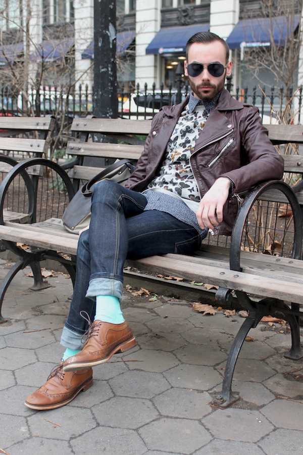 Showing you how to use trends from New York Fashion Week, my friend Ben and I styled him with a bold oxblood biker jacket over some power pattern clashing featuring a mini floral print shirt from Club Monaco and a fun butterfly jumper from Topman LTD. Ben’s slick-backed hair was perfect, adding that extra cool factor to the look, and we accessorized with shades from Warby Parker and Hudson’s brogues.