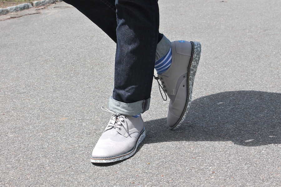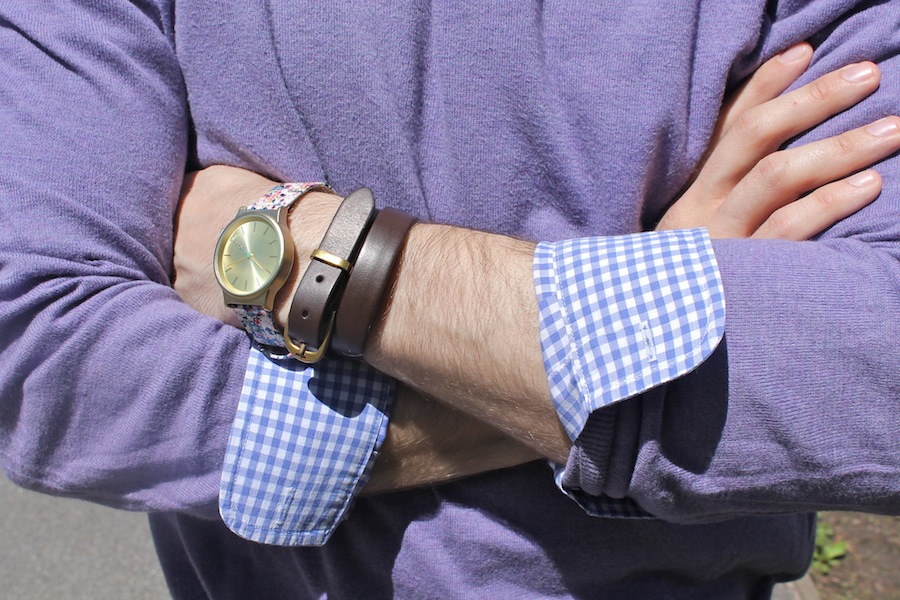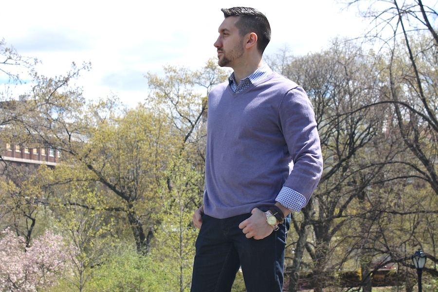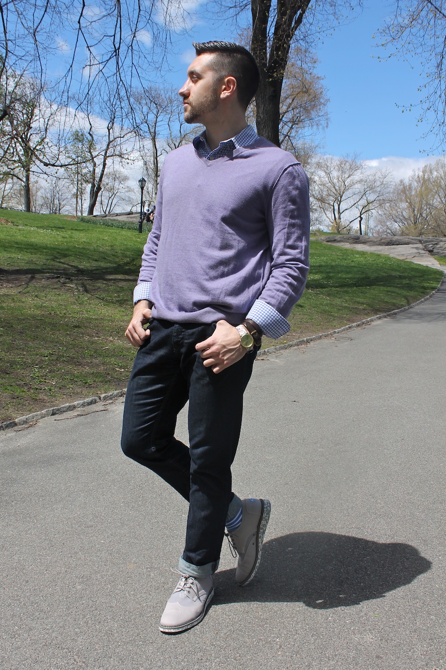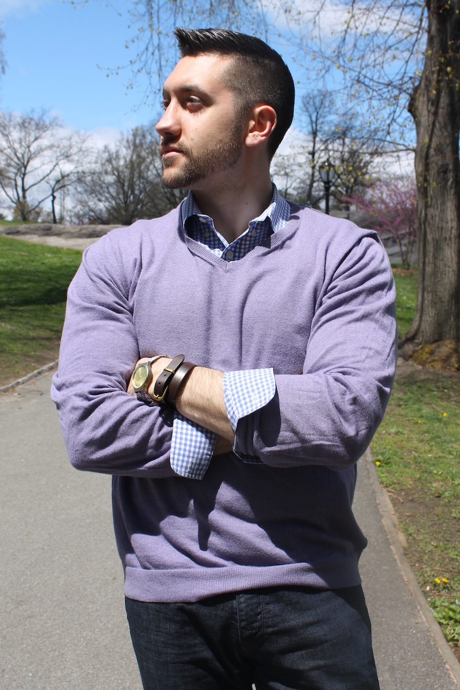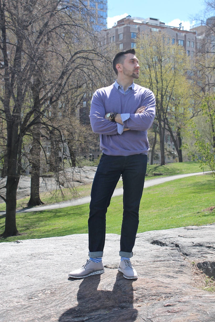 Using season appropriate tones of light blue and light pastel purple for the outfit, we added some personality to the look with a paint splatted gold face watch from Komono, Coach + Philip Crangi’s brown leather double wrap bracelet, a leather matching belt from Ernest Alexander and TOMS’ Ash Flecked Sole Brogues which managed to look great with the matching Central Park pavement and rocks.