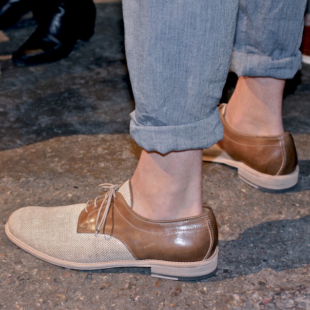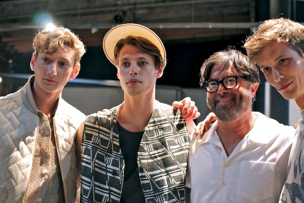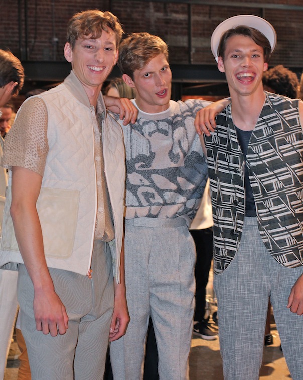 For Billy Reid’s collection collection shown at ArtBeam, Reid features hand-knit jacquard sweaters and other knits, wide knee-length shorts, polyester trenches and more loose, relaxed styles in a palette of neutrals. It was a sea of earth tones such as oatmeal, cream, bronze and bone, and a few pieces with blue and black. I interviewed the Alabamian designer for AskMen.com, for which Reid said he and his design team wanted to keep things extremely soft and uncluttered.