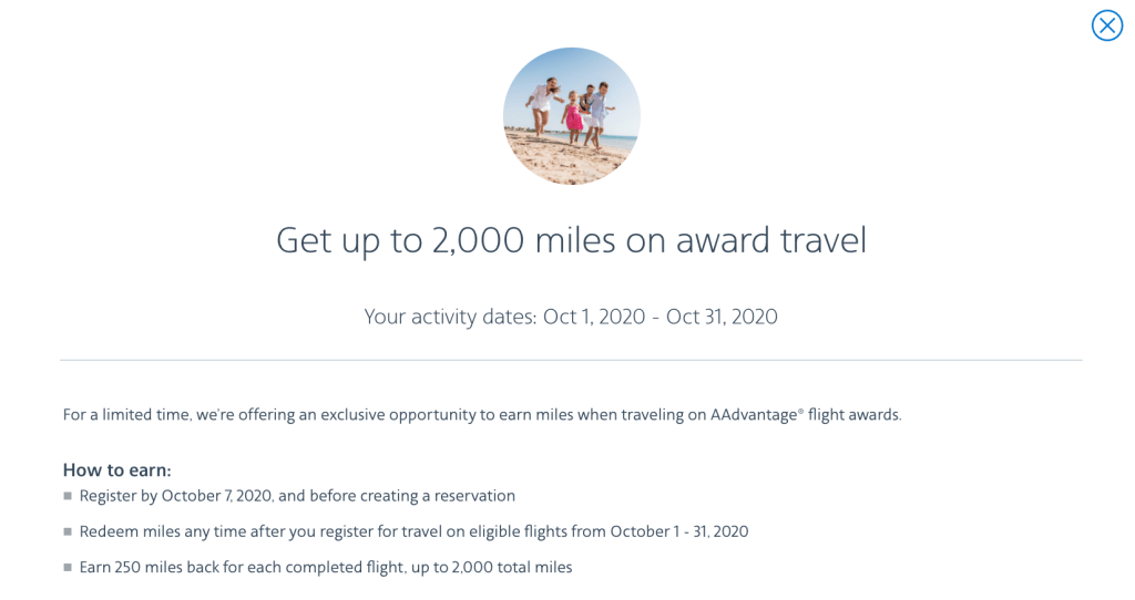 - Register by 11:59 p.m. CT on October 7, 2020, and before creating a flight reservation, redeeming miles and traveling in order for your award flights to count toward this promotion