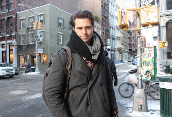 In this street style feature for Out magazine, I wandered around SoHo and found off-duty model Ryan Medel, of New York’s Major Model. He’s sporting an eye-catching mixed-stitch scarf from Brooklyn Industries, and added some casual luxury to his outfit with a watch and boots by Diesel.